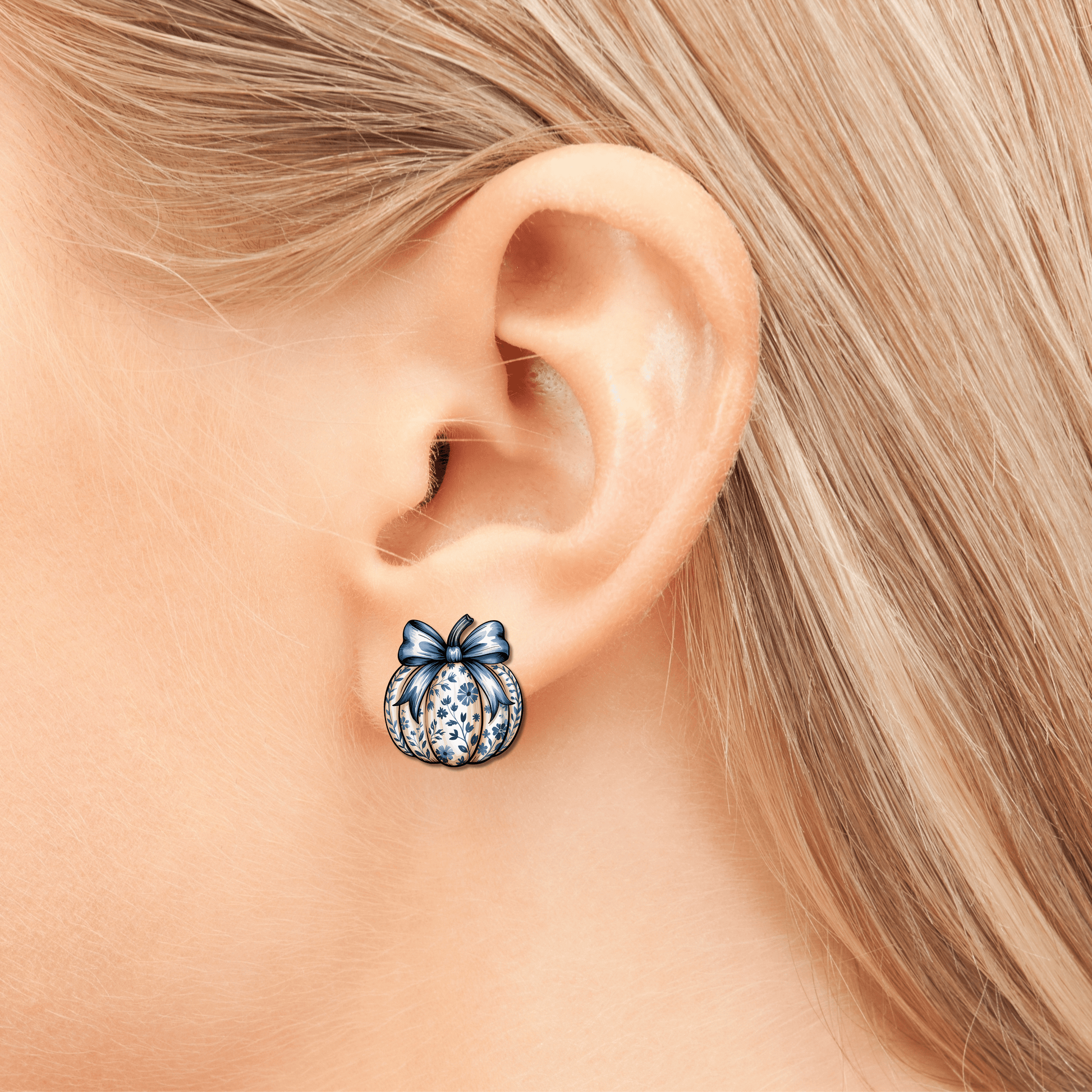 Add a touch of elegance to spooky season with these Blue Floral Pumpkin Stud Earrings! Featuring a crisp white pumpkin accented with delicate blue floral designs and topped with a matching blue bow, these earrings bring a chic twist to fall fashion. Lightweight and comfortable, they’re perfect for autumn outfits, pumpkin patch dates, and Halloween fun with a classy touch.