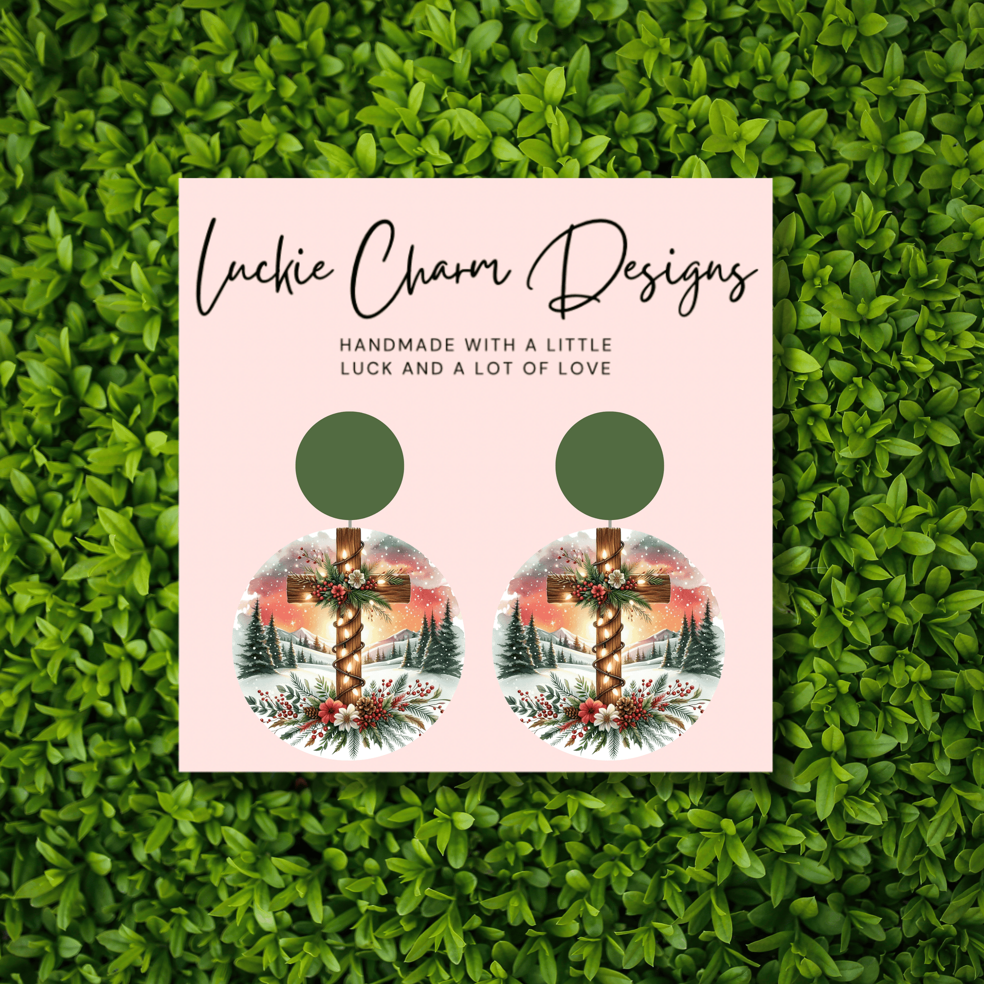 Celebrate faith and the beauty of the season with these Winter Cross Drop Dangle Earrings. Featuring a rustic wooden cross wrapped in garland, set against a snowy landscape, these earrings perfectly blend Christmas charm with timeless inspiration.
